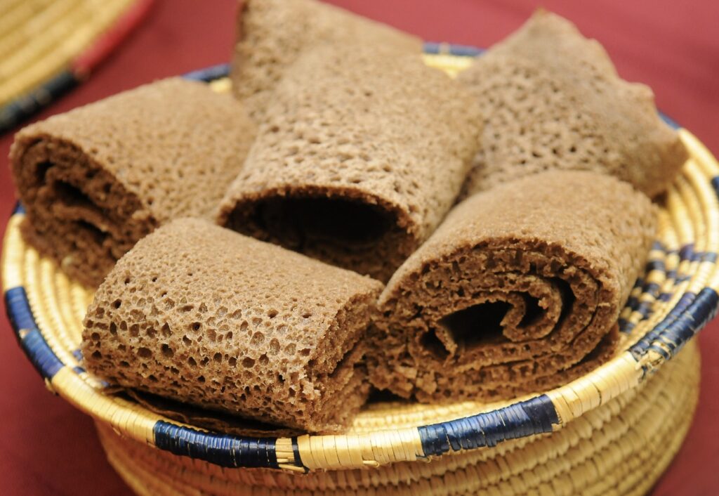 Injera bread, an Ethiopian staple food, is made from teff flour.